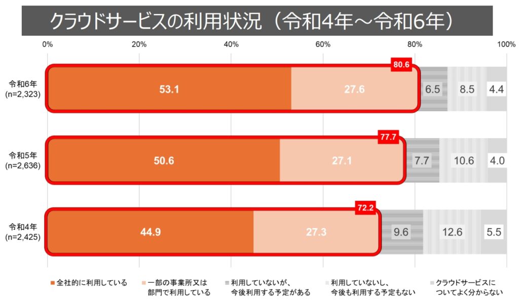 総務省の令和7年の報告によると、クラウドサービスを利用している企業の割合は年々増加しており、令和6年時点では、企業の80.6%は何らかの業務でクラウドサービスを利用しています。