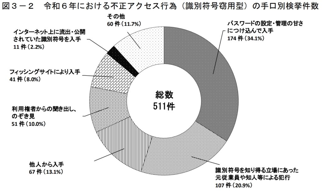 実際、警察庁が令和7年3月に発表した「不正アクセス行為の発生状況」によると、識別符号窃用型(※)の不正アクセスの原因として最も多かったのは、「パスワードの設定・管理の甘さ」であり、件数は230,174件に上りました。