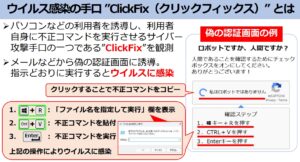 近年、世界各国で急速に拡大し、深刻な脅威として問題視されているのが、「Clickfix(クリックフィックス)」と呼ばれるサイバー攻撃の手口です。