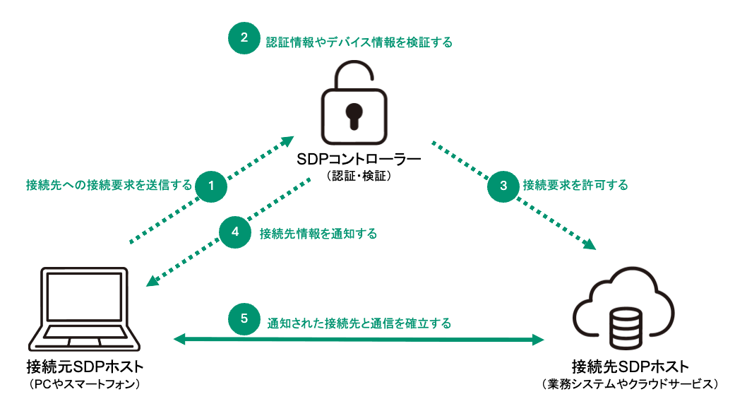 - SDPとは、ユーザーやデバイスの状態に応じてネットワークの境界をソフトウェアで動的に構成し、認証された対象にのみ必要なシステムを公開するセキュリティ技術