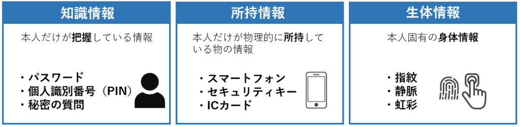 多要素認証とは、ユーザーの身元確認のため、「知識情報」「所持情報」「生体情報」の中から2つ以上の認証要素を組み合わせて認証をおこなうセキュリティ手法のことです。