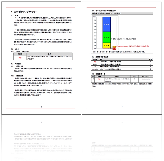 診断結果は自社サイトが抱えるリスクを「点数」で可視化し、報告書には、経営層がリスクを把握できるようにまとめたエグゼクティブサマリーのほか、発見された脆弱性の対策・修正提言なども含まれます。