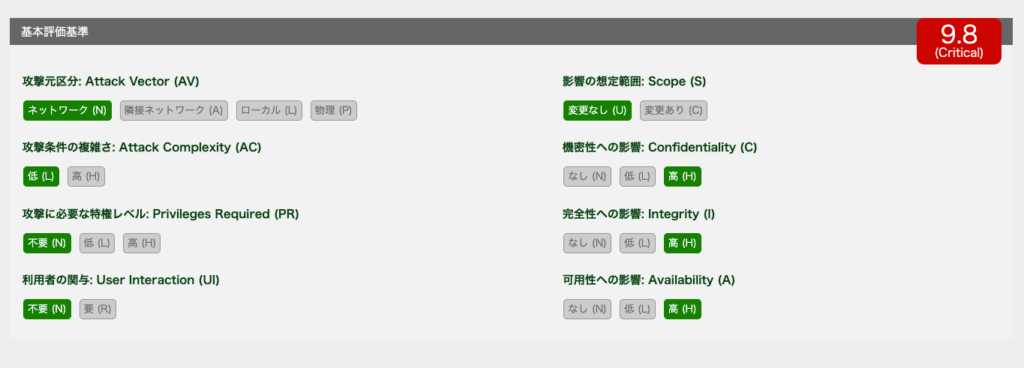 例えば、以下の結果では「9.8Critical」と記載されており、CVSSの中でもほぼ最高値に近く、極めて深刻な脆弱性であることがわかります。