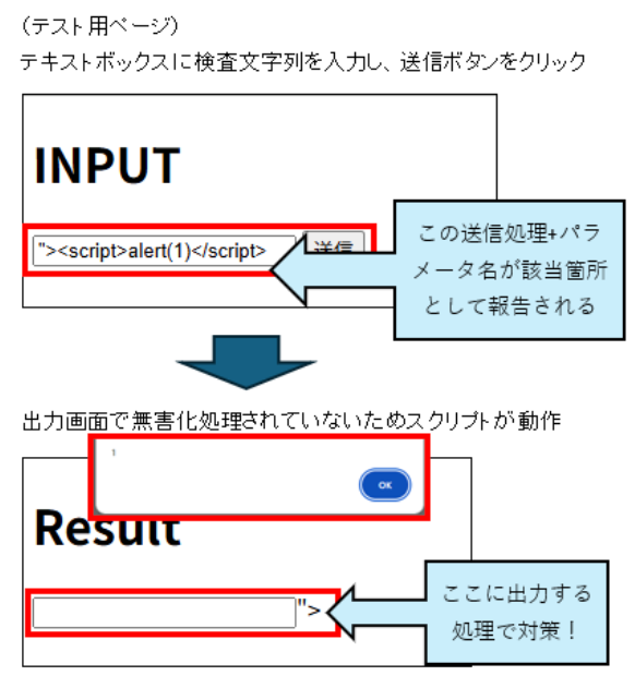 その結果、入力箇所が「脆弱性の該当箇所」として報告されます。