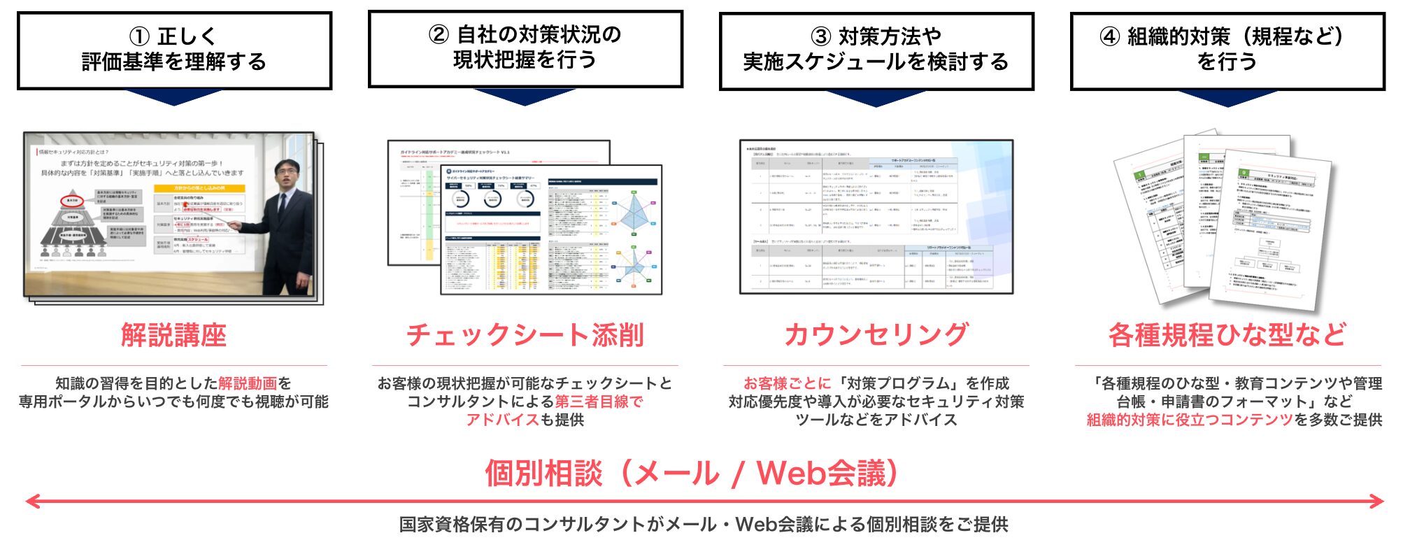 「ガイドラインの内容が難しくてわからない」「前提となるセキュリティ対策の知識が足りない」といったお悩みに対して、コンサルタントによる伴奏支援をはじめ、解説動画の提供や個別相談などを通じて、実践的な対策の実行をサポートします。