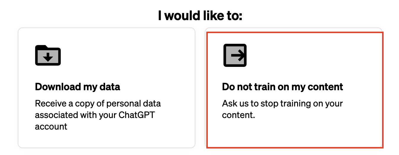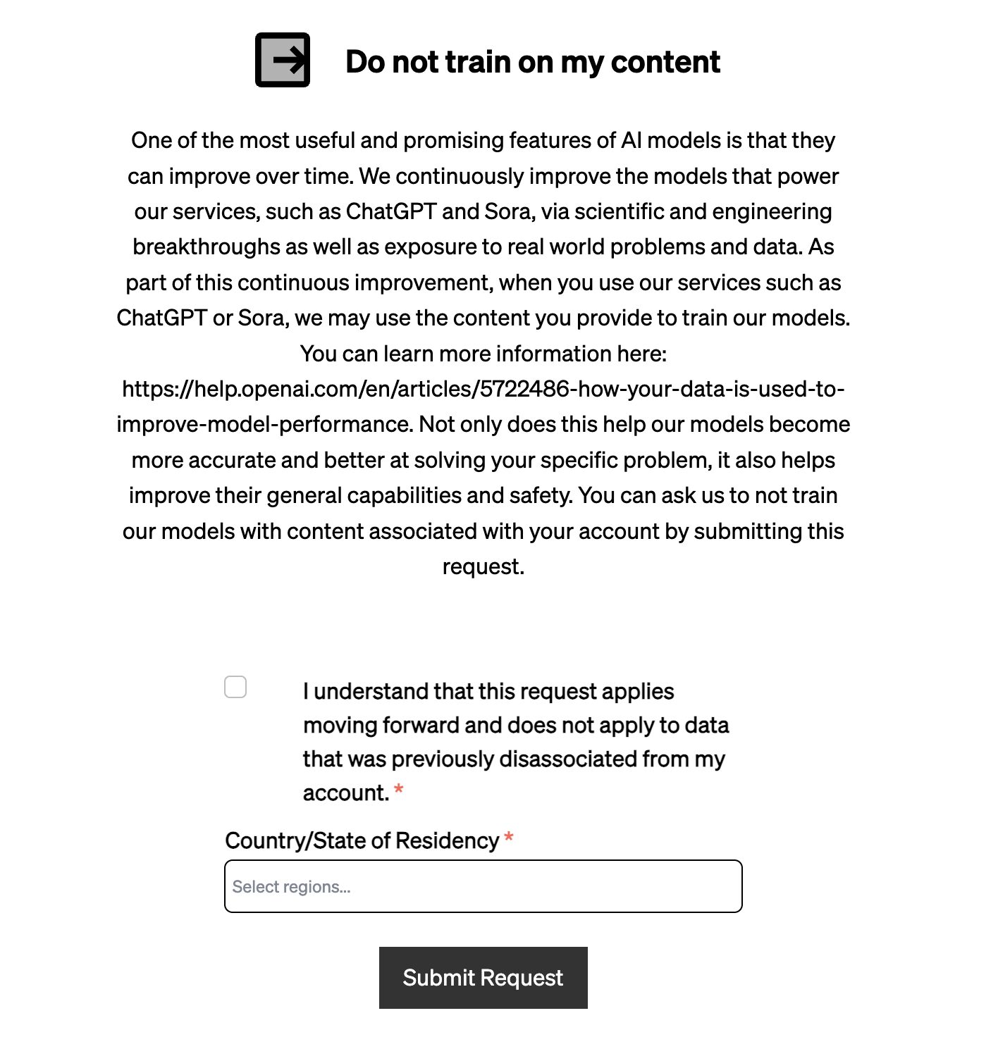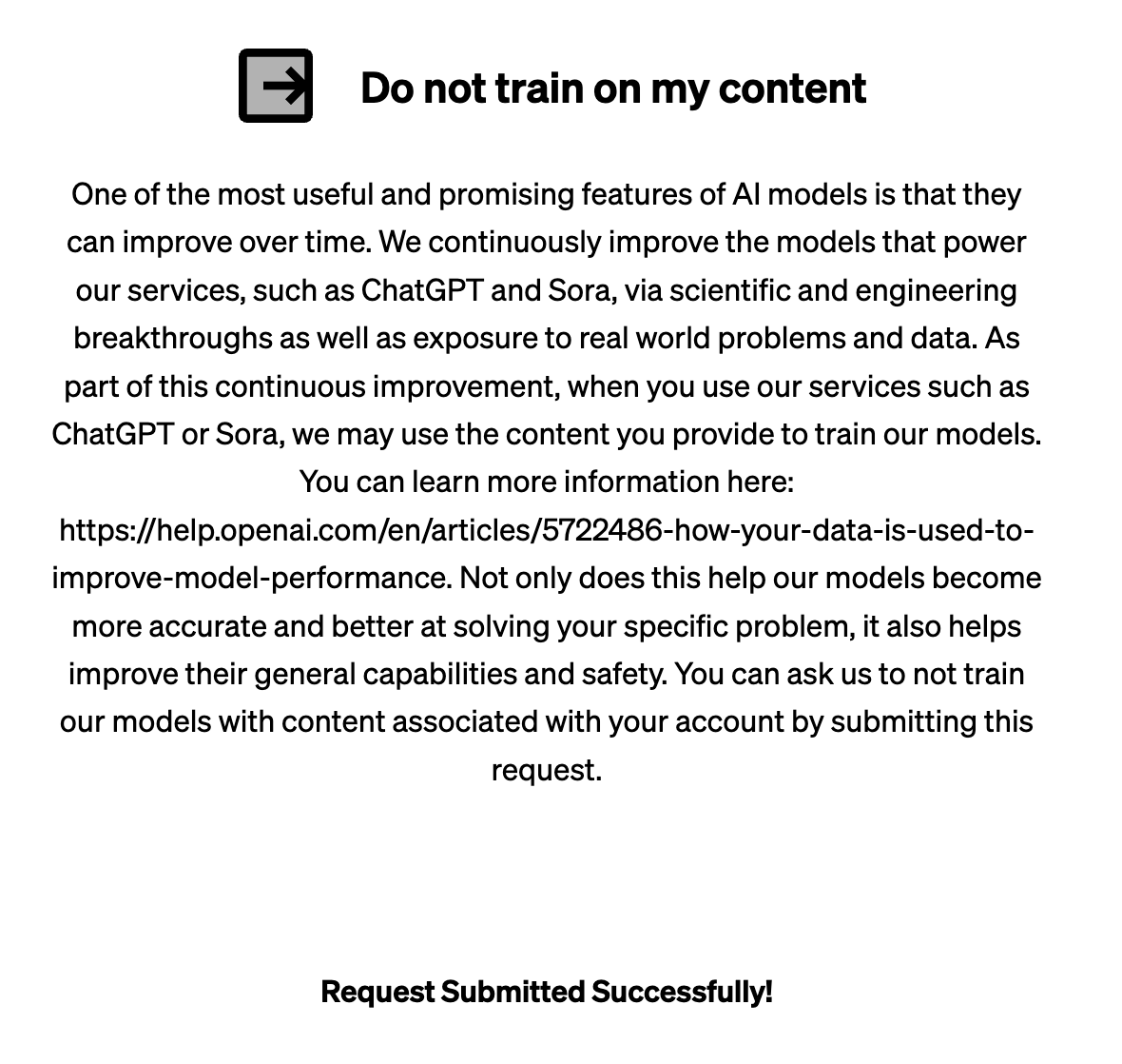 Do not train on my content – If you want to permanently opt out of your content being used for model improvements, you can make a request here.