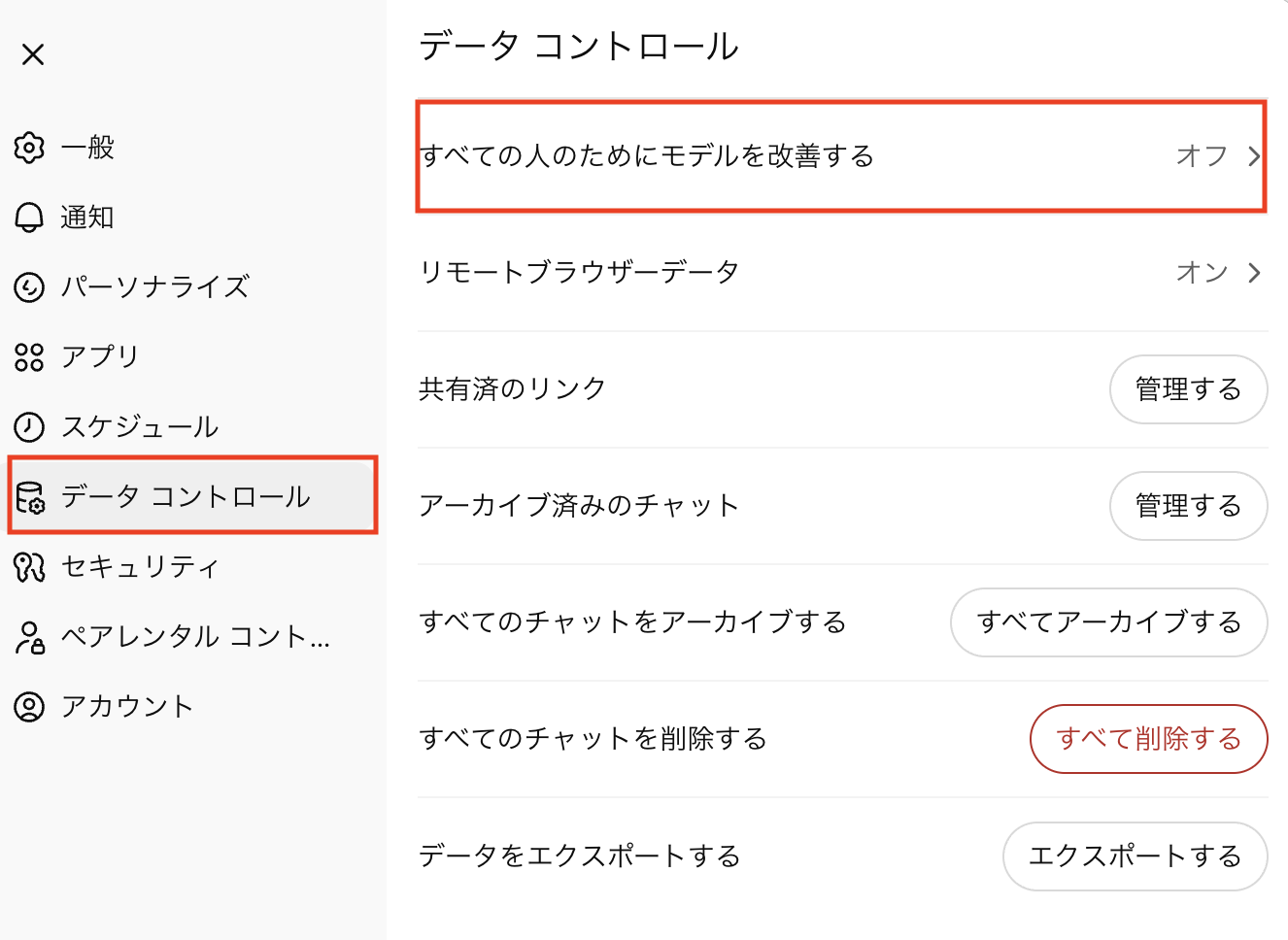 設定方法は無料版・有料版ともに共通で、設定画面の「データの使用」項目から、「すべての人のためにモデルを改善する」の設定をオフにすることで、オプトアウトが適用されます。