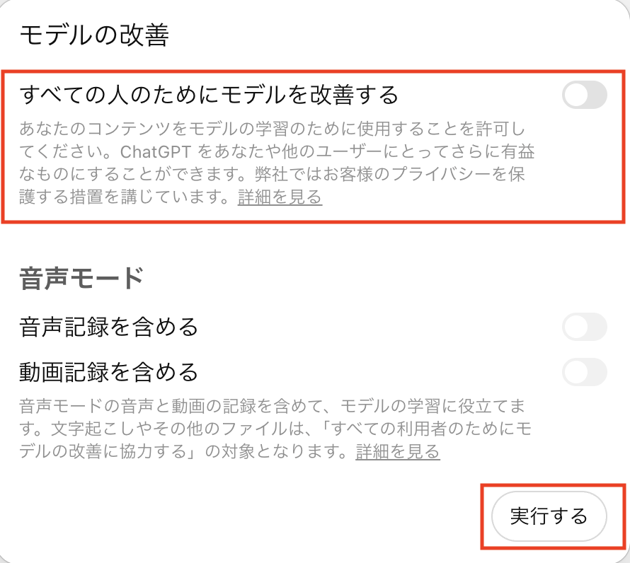 | 手順(3) | ・「すべての人のためにモデルを改善する」のスイッチをオフにし、「実行する」を選択する