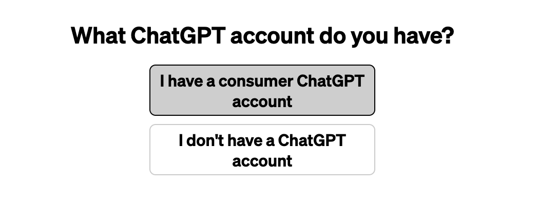 | 手順(2) | ・ ChatGPTアカウントを持っている場合は、「I have a consumer ChatGPT account」を選択する