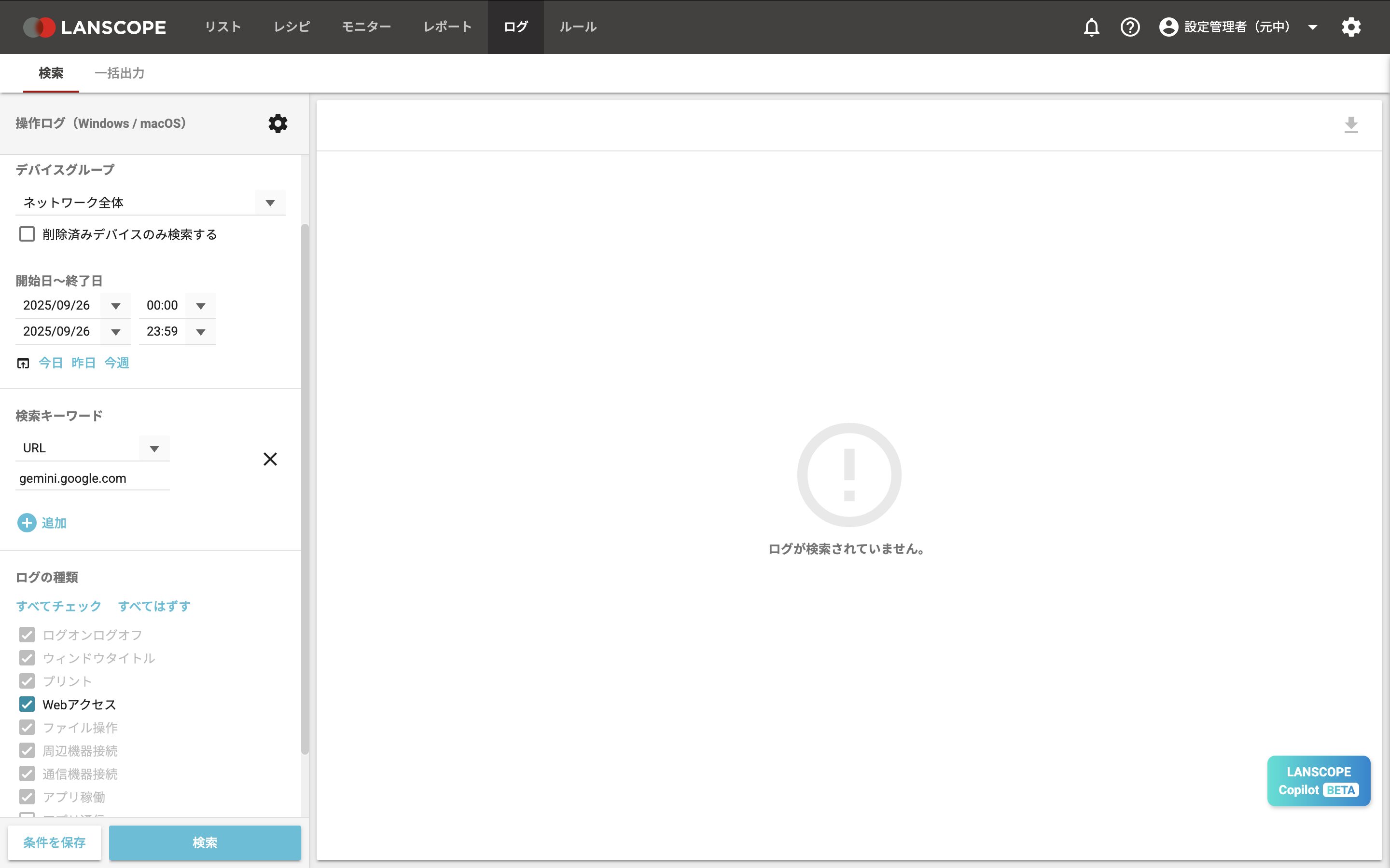 「LANSCOPEエンドポイントマネージャー クラウド版」を活用することで、Geminiの利用状況の把握や利用そのものを禁止することが可能です。