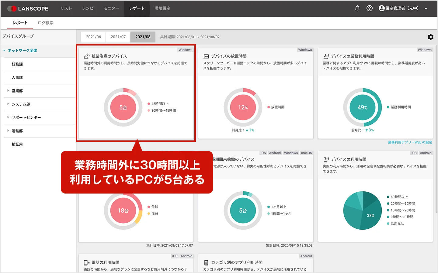例えば、リモートワークで課題になりやすい「長時間労働」や「サービス残業」の課題に対しては、PCの操作ログからレポートを自動作成し、30時間以上、設定した業務時間外にPC操作を行っているデバイスをひと目で把握できます。