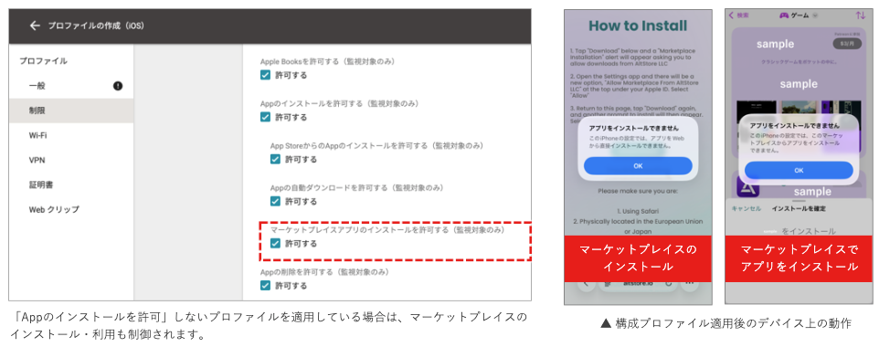 また、iOSデバイスにおいては、従来から提供しているApp Storeの利用制限に加えて、代替アプリマーケットプレイスの利用を制限する構成プロファイルの作成・配信機能にも対応しました。