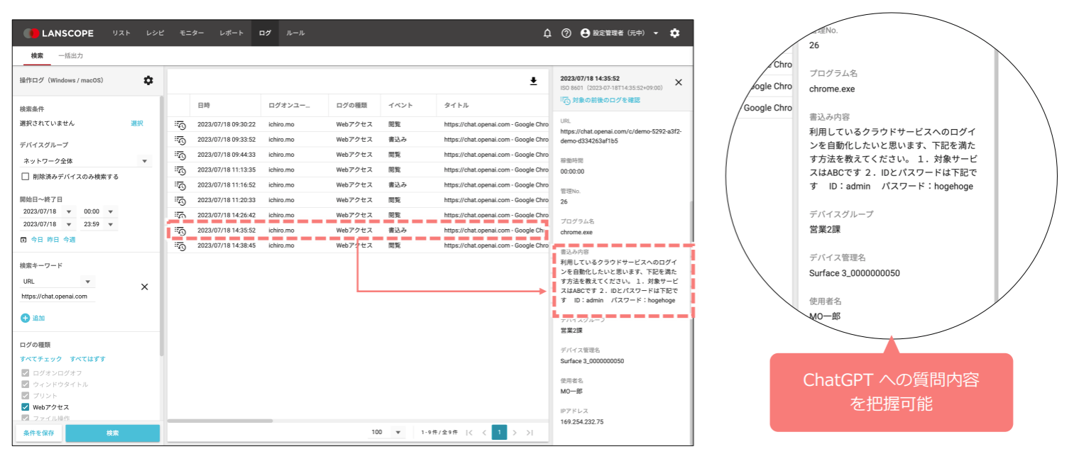 本ツールでは、従業員がChatGPTに書き込んだ内容(プロンプト)を、管理者側が操作ログとして取得・閲覧することが可能です。※