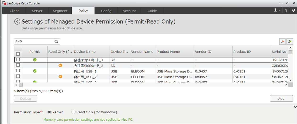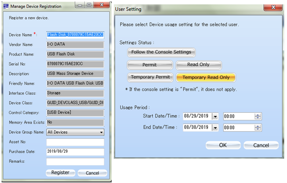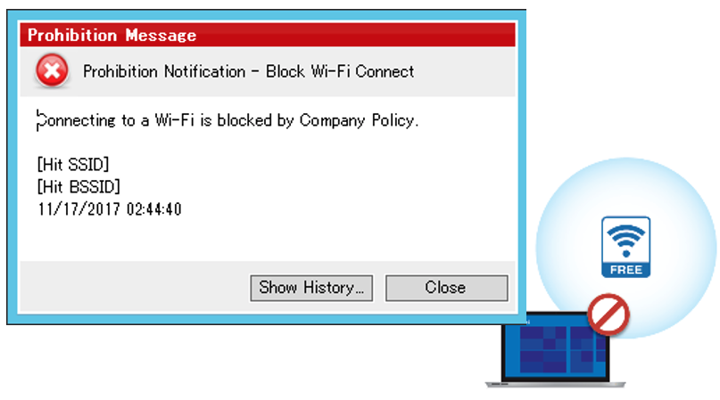Manage all company devices and limit their use. If a prohibited device is connected, the user is notified that it is prohibited and illicit use is controlled. Also, allow device use in limited situations through setting detailed conditions by PC and device to adapt to the workplace.
