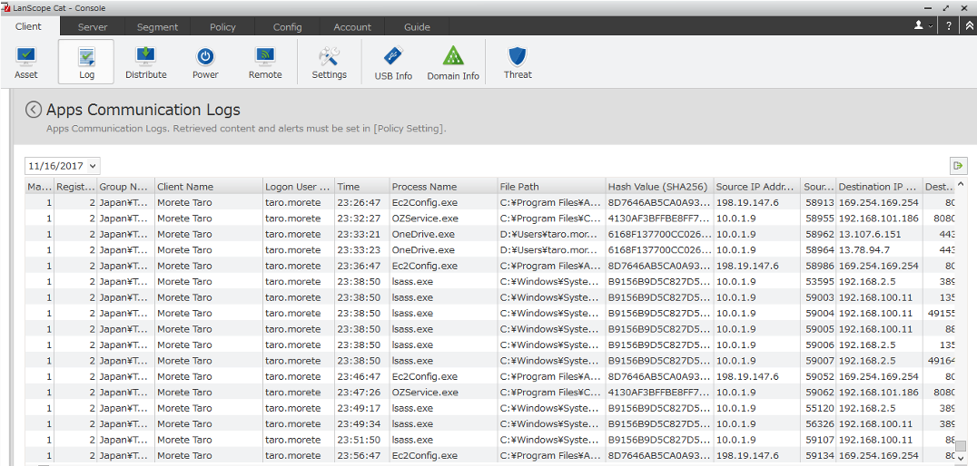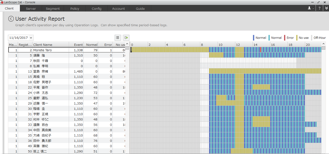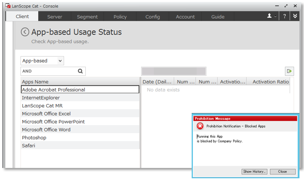 Record usage of PC such as running apps, printing, file operation, screen browsing (window title). If there is a violation operation, it warns the user and urges security morale improvement. In addition, we notify manager in real time and prevent serious problem beforehand.