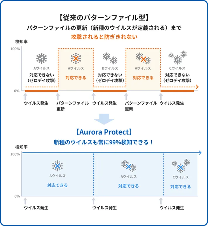 次世代AIアンチウイルス「Aurora Protect」との連携により、マルチウェア感染を高精度に検知。必要最低限の工数で対処することが可能です。