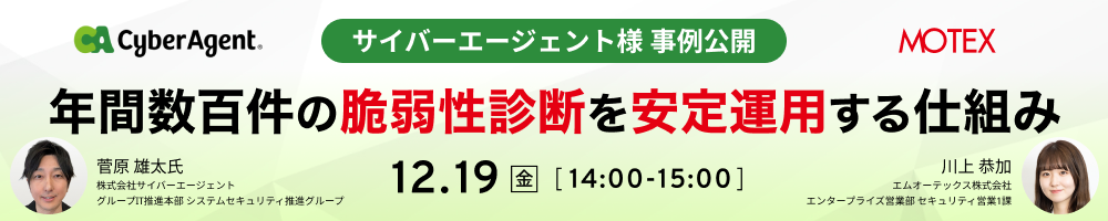 年間数百件の脆弱性診断を安定運用する仕組みとは株式会社サイバーエージェントが、年間数百件の脆弱性診断を開発プロセスに組み込み、効率的かつ安定的に運用する仕組みを紹介します。複数ベンダー併用や内製体制の活用、技術評価のポイント、案件ごとのスケジュール管理など、現場ですぐ活かせる運用ノウハウを具体例とともに解説します。 講師:株式会社サイバーエージェント グループIT推進本部 システムセキュリティ推進グループ 菅原 雄太氏